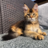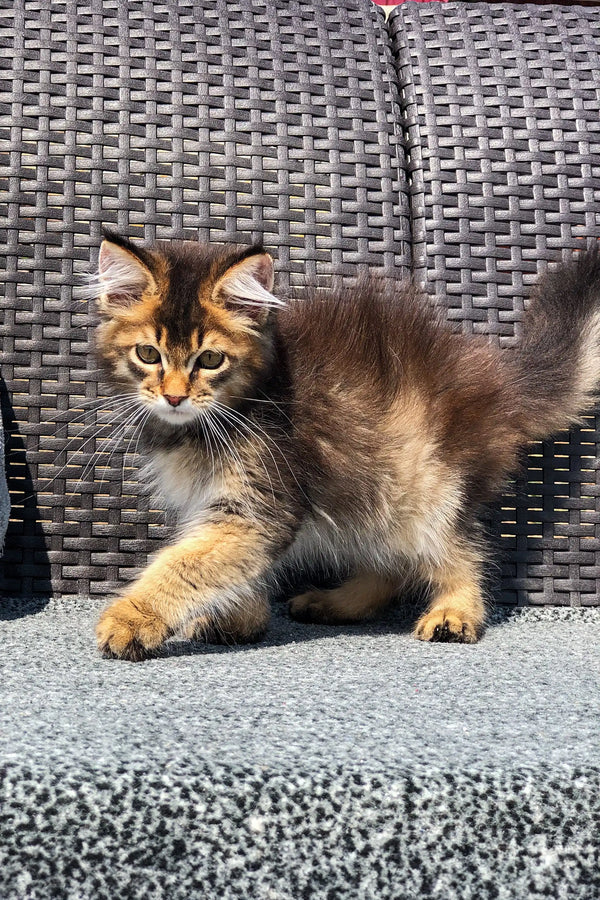 Introducing Amazonia, a captivating female golden maine coon with a lush black golden ticked tabby coat and enchanting hazel eyes. This very rare among its breed beauty stands out with her exceptional golden coat, beautiful head with well-set ears, long tail, and excellent profile marking her as a rare gem in the maine coon community.