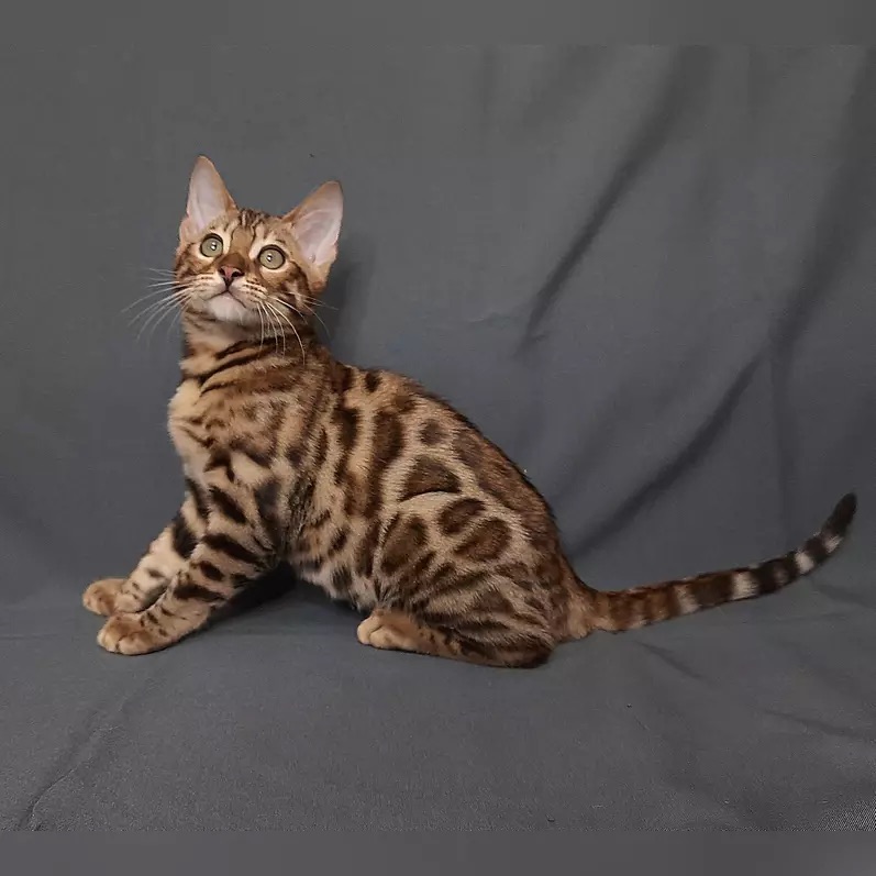 Hello, future family! My name is Bagir, and I am a stunning female bengal kitten with a mesmerizing brown spotted tabby coat and striking green eyes that will capture your heart. My leopard-like markings and vibrant golden hue make me look like a little wildcat, but don’t be fooled—I’m all about love and companionship. I come from rare and exceptional bloodlines, ensuring that I not only have the breathtaking appearance of my breed but also the playful and affectionate personality that makes bengal kittens so special. At just 10 Weeks old, I am full of energy, curiosity, and charm, ready to bring endless joy into your home.