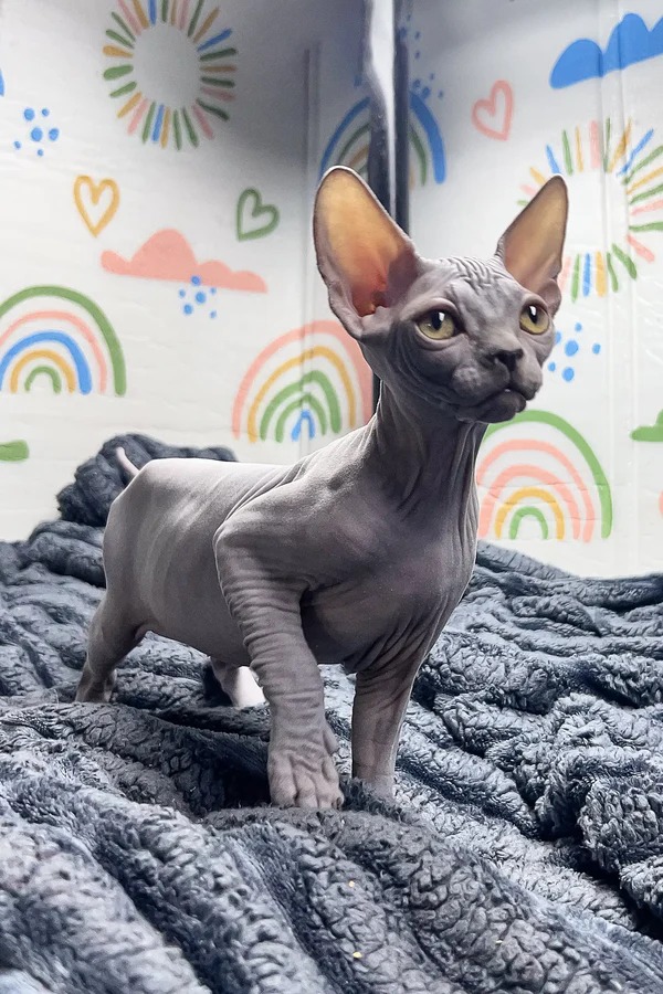 Meet Bruno, a striking male canadian sphynx kitten with a rare and stunning blue coat and captivating green eyes. His modern face, distinctive wide ears, and sleek appearance make him a true standout among kittens. Expected to reach a graceful adult weight of 10-13 lbs, Bruno embodies the charm and elegance of his breed. With his playful, curious, and cuddly nature, he’s a joy to be around and is sure to melt your heart. Bruno loves exploring his surroundings and curling up close for warm snuggles.