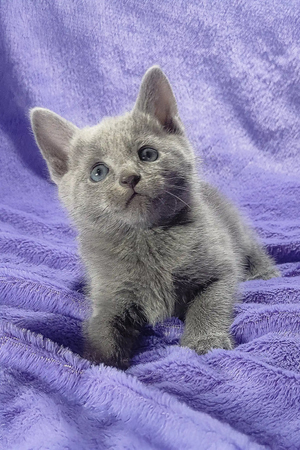 Hello, I’m Cliff, a charming 10 weeks old male russian blue kitten, with a soft, blue coat and striking emerald eyes that will capture your heart at first glance. I have an energetic and playful personality that makes me the perfect companion for your family. You’ll often catch me jumping on my hind legs in a funny and amusing way—I’m always looking for a good time! Whether I’m chasing a toy, climbing around, or sitting on your hands, I promise to bring lots of joy and laughter into your home.