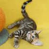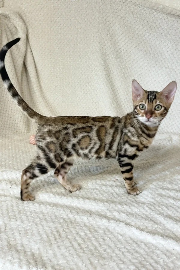 Hi there, my name is Dexter—and I’ve been waiting for someone just like you. I’m a male Bengal kitten with a sleek, brown rosetted coat that looks like it was painted by nature herself. My green eyes are full of curiosity and sparkle with mischief, but don’t let my wild looks fool you—I’m all heart. At just 3 months old, I’m already showing off my athletic build, medium round rosettes, and my favorite skill: pouncing on anything that moves. I’m more than just eye-catching—I’m energetic, friendly, and incredibly affectionate, always ready to curl up next to you after a good play session.