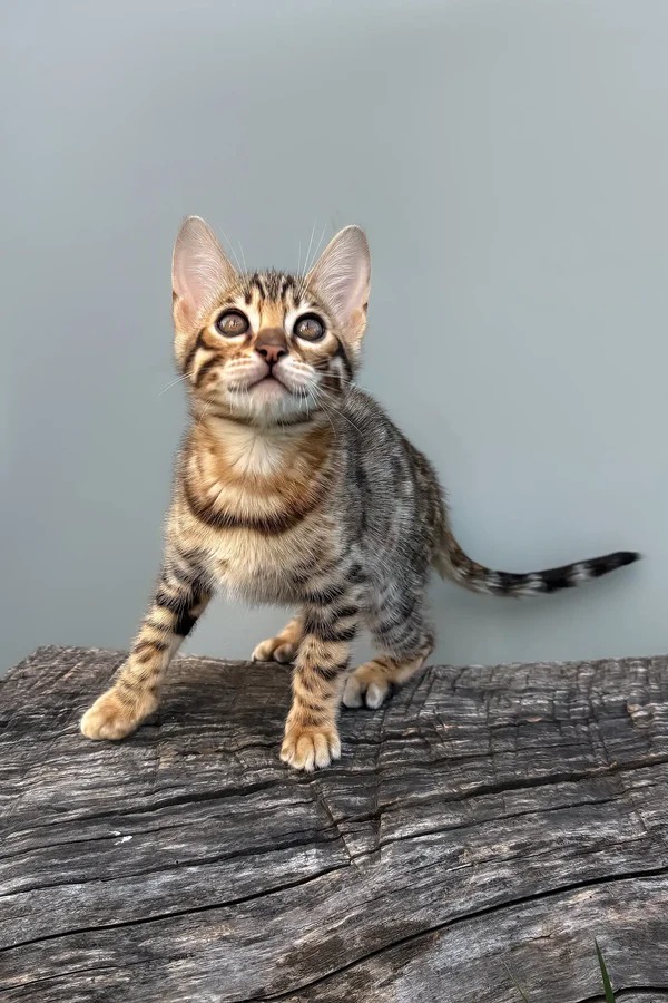 Hello, my name is Elina, and I am a breathtaking 10 weeks old female bengal kitten with a striking brown black spotted tabby coat and enchanting green eyes. My fur is a true work of art, boasting a high-contrast, vibrant pattern that accentuates my exotic beauty. Every detail of my appearance, from my expressive whisker pads to my perfectly sculpted profile, reflects the elegance and refinement of my rare bloodline. I carry the signature wild allure of my breed while possessing a gentle, affectionate nature that makes me the perfect companion.
