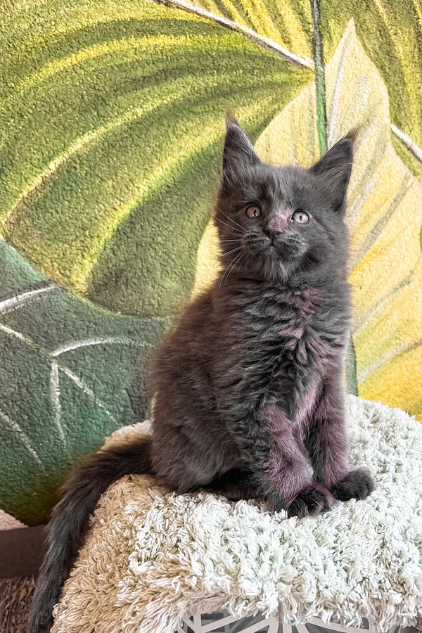 Meet Erik, a stunning male maine coon in a striking blue coat, complemented by his captivating green eyes. Erik possesses unique traits that will steal your heart: a luxurious chic fur coat that cat lovers adore, exceptional bloodlines, and an impressive breed type. With an approximate adult weight of 24-26 lbs, this kitten promises to be both a gentle giant and a loyal companion. Erik is playful, very affectionate, and warm, making him the perfect addition to any family. He loves to be around you and gets along well with other animals.