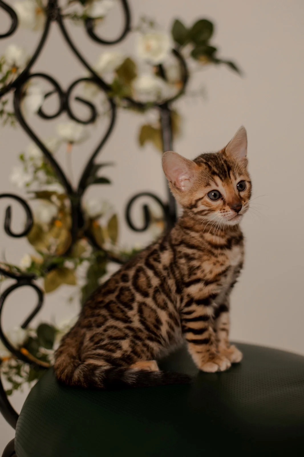 Frozen is more than just a bengal kitten—she’s a masterpiece of nature. Her sepia-toned coat, marked by a striking contrast of spotted patterns, is paired with mesmerizing turquoise eyes that captivate everyone she meets. With prominent whisker pads and a perfectly sculpted profile, Frozen embodies the elegance and charm that make the bengal breed so sought after.