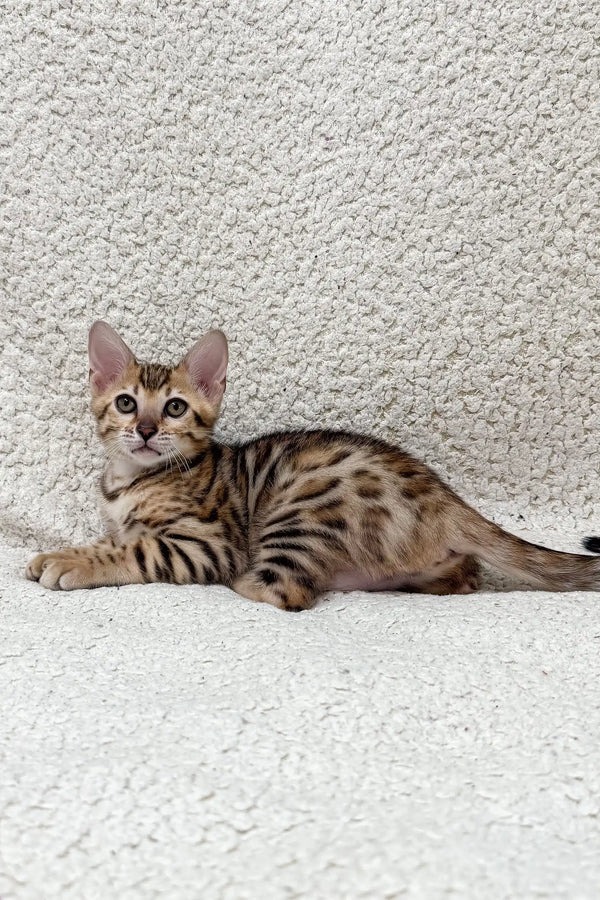 Holly is a beautiful bengal kitten with a dazzling brown spotted tabby coat and mesmerizing green-brown eyes. Her striking coat pattern features symmetrical rosettes aligned perfectly along her back, showcasing the hallmark elegance of her breed. With an excellent profile and vibrant energy, Holly is expected to grow into an impressive adult weight of approximately 10-13 lbs. Her playful and affectionate nature makes her an ideal addition to any home, whether you’re a family or an individual seeking a loyal companion.