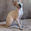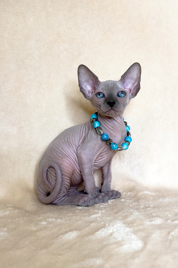 Kira is a canadian sphynx female with a stunning blue mink coat and captivating aquamarine eyes. She is characterized by her trendy blue fur, big ears, and large expressive eyes, making her highly sought after by cat lovers. With great bloodlines and an excellent breed type, Kira embodies both beauty and grace. When fully grown, she is expected to weigh approximately 6-9 lbs, perfect for cuddling and companionship. Kira is gentle, affectionate, and calm, making her an ideal addition to any family. She thrives on human interaction and does well with other pets, creating a harmonious home environment.