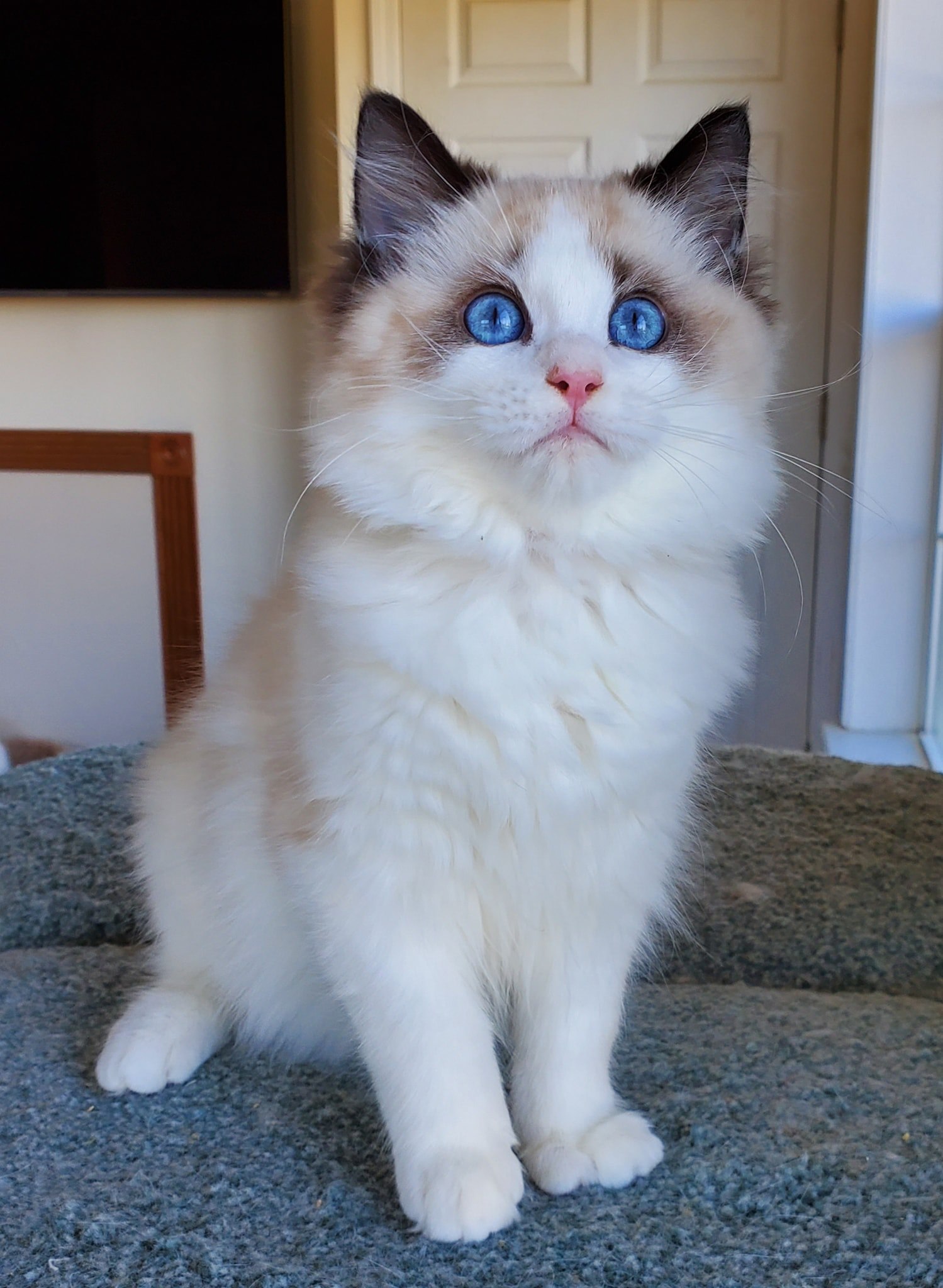 Meet Klara, a stunning female ragdoll kitten with a beautiful blue bicolor coat and sparkling blue eyes that will captivate anyone who meets her. Klara is the epitome of feline charm—friendly and full of curiosity, but with a calm, soothing presence. She rarely meows, and when she does, her voice is as gentle as a whisper. Her easygoing nature makes her adaptable to any home, and she gets along wonderfully with children and other pets.