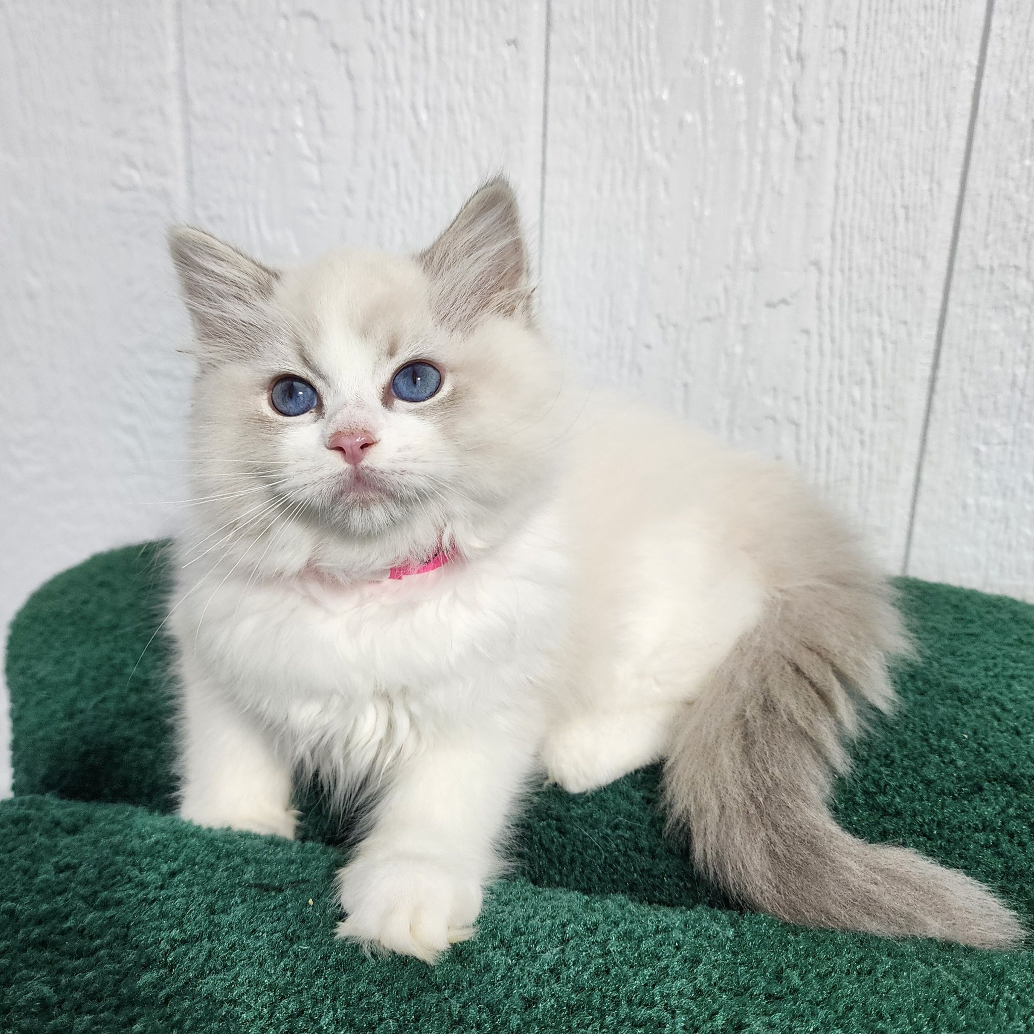 Leiia is a gorgeous Ragdoll female kitten with silky soft fur and mesmerizing blue eyes. She is affectionate, playful, and loves to be cuddled. With her sweet temperament and loving nature, Leiia will be the perfect companion for a warm and happy home.
