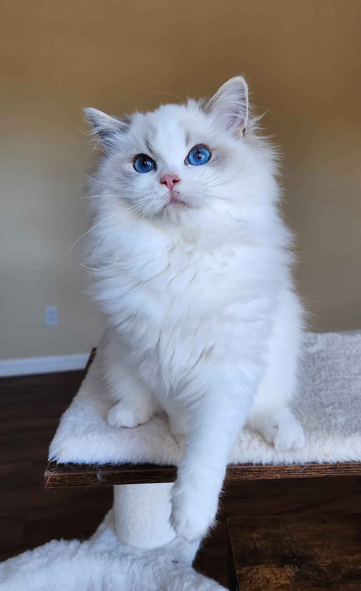 Letta is an adorable Ragdoll kitten who will instantly melt your heart. With her tiny stature and playful nature, she is the purrfect addition to any loving home. Letta’s charming personality shines through her bright, curious eyes. She loves to explore her surroundings, always on the lookout for new adventures. Whether it’s chasing after a toy or pouncing on a feather, Letta’s enthusiasm is contagious. This pint-sized feline is also incredibly affectionate. She adores snuggling up in your lap, purring contentedly as you stroke her soft fur. Letta is a true companion, always ready to provide comfort and companionship.