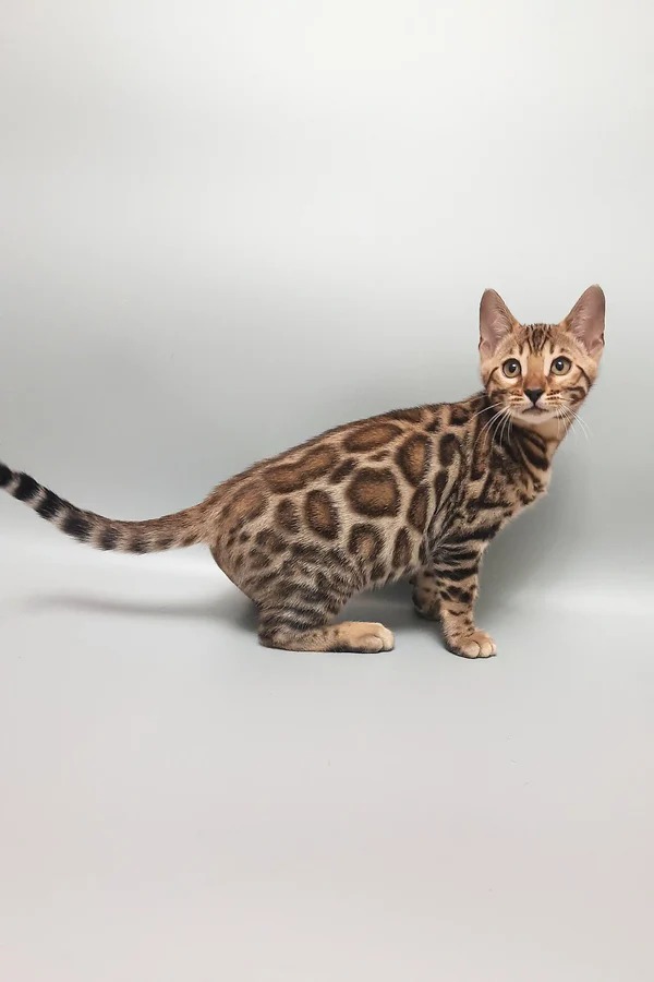 Introducing Marseille, a breathtaking male Bengal kitten with a sleek brown spotted tabby coat and mesmerizing green eyes. His richly patterned fur and bold, exotic look make him a standout among Bengal enthusiasts.