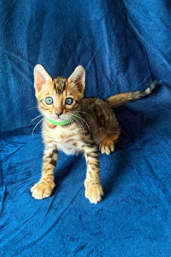 Meet Melvyn, a stunning bengal male with a brown spotted tabby coat and striking yellow eyes. His coat color and strong vibrant shade are highly sought after by cat lovers. Melvyn boasts rare bloodlines and an excellent breed type, making him a truly unique addition to any family.