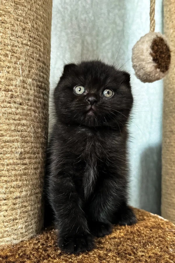 Hello, future family! I’m Umka, a 11 weeks old female scottish fold kitten with a sleek black coat and stunning amber eyes that will melt your heart. I’m not just any kitten—I come from rare bloodlines and have an exceptional breed type, making me the perfect blend of elegance and charm. My round face, gentle demeanor, and adorable folded ears make me stand out in a crowd. I’m a curious little explorer, and I love to talk to my humans, sharing my thoughts with cute little meows and funny sounds. My intelligence keeps me curious and playful, and I’m always looking for new ways to keep things exciting, whether it’s discovering new corners of the house or entertaining you with my mischievous antics. I’m affectionate, gentle, and playful—traits that make me the ideal companion. I love curling up next to you for some quality cuddle time, and my playful nature ensures I’ll keep you smiling all day long.