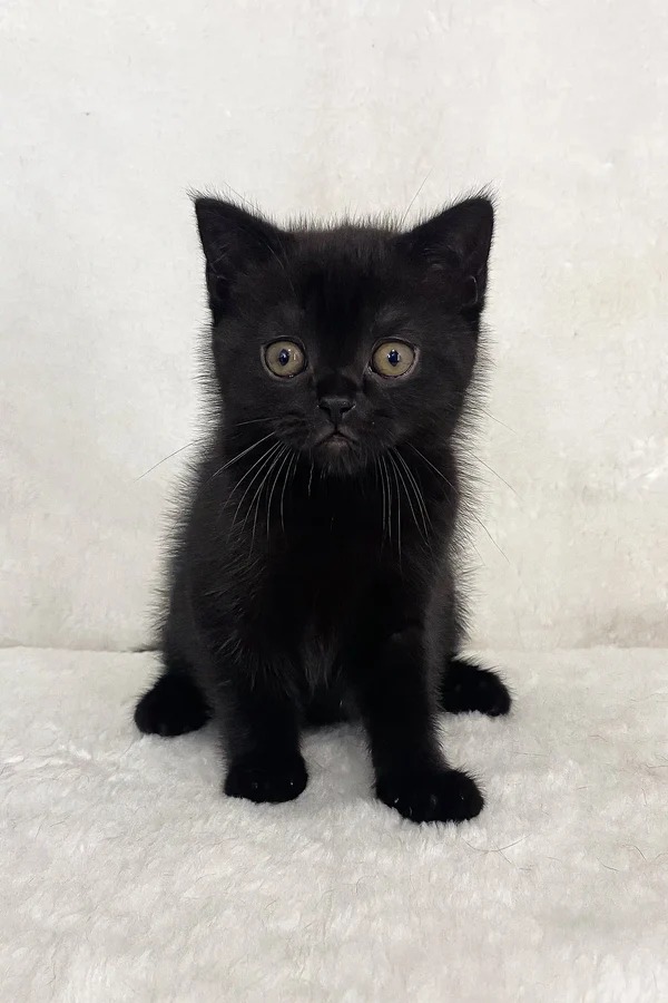 Hello! I’m Whoopee, a playful and charming 10 weeks old male Scottish Straight kitten, and I’m ready to bring joy and excitement into your home. With my sleek black coat and captivating orange eyes, I’m sure to steal your heart at first glance. My short to medium coat is not only soft but easy to care for, so you can spend less time grooming and more time enjoying my company. My round face and adorable eyes make me irresistibly cute, but it’s my playful and active personality that truly shines!